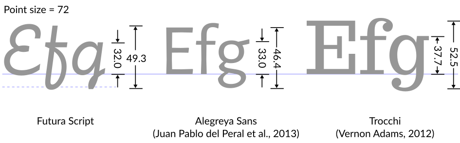 This does not mean extravagant fonts always have a small x-height or sans serif faces always have a larger x-height than serif ones. For a counterexample, let’s compare Futura Script (a commercial typeface), Alegreya Sans (created by Juan Pablo del Peral et al., released 2013), and Trocchi (created by Vernon Adams, released 2012).