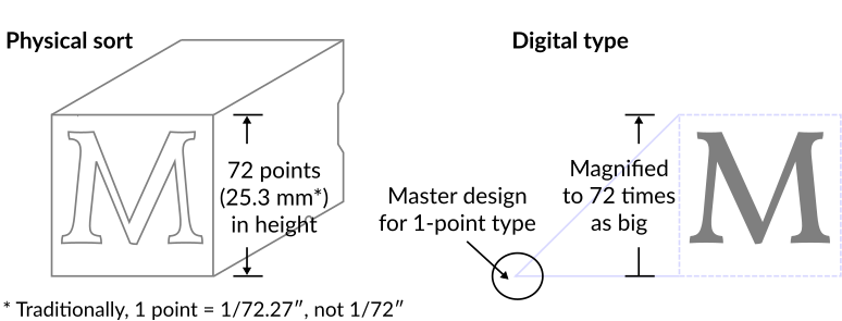 In the past, the point size was the actual height of a piece of wood or metal called a sort. So in principle, it should have been based on reality; in practice, this isn’t always the case because, Bringhurst (301) points out, sometimes designs were cast on a sort of a different size than the size they were designed for, causing the point size to not match the height of the sort.