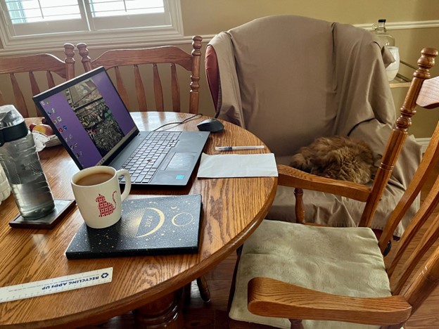 My workspace isn’t fancy; it also isn’t technically a workspace. I primarily work at my family’s dining room table, sitting on a wooden chair with a single cushion on the seat. Often, one (or more) of my seven pets joins me. Sometimes I even pull up an extra chair for them. I work in the dining room so that I can keep an eye on the pets and so they can keep an eye on me. To set the mood (work for me, rest for the pets), I put CBC Music on the radio – they play classical music for most of the day, and there are fewer ads than Classical FM. In the winter months, I light candles to chase away the darkness.