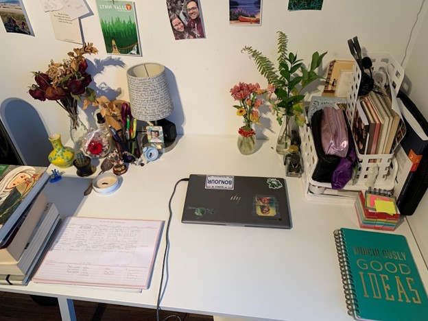 My second strategy is to surround myself with objects that remind me why I work. I’ve covered the walls around my desk with pictures and notes from my friends and family, and part of my desk is dedicated to beautiful items. I have vases full of fresh and dried flowers from my partner, a spoon that my best friend got engraved with a Virginia Woolf quotation, and a statue of Mary Undoer of Knots. My workspace is also a great place for my currently-reading book pile, which reminds me why I’m in love with reading others’ work.