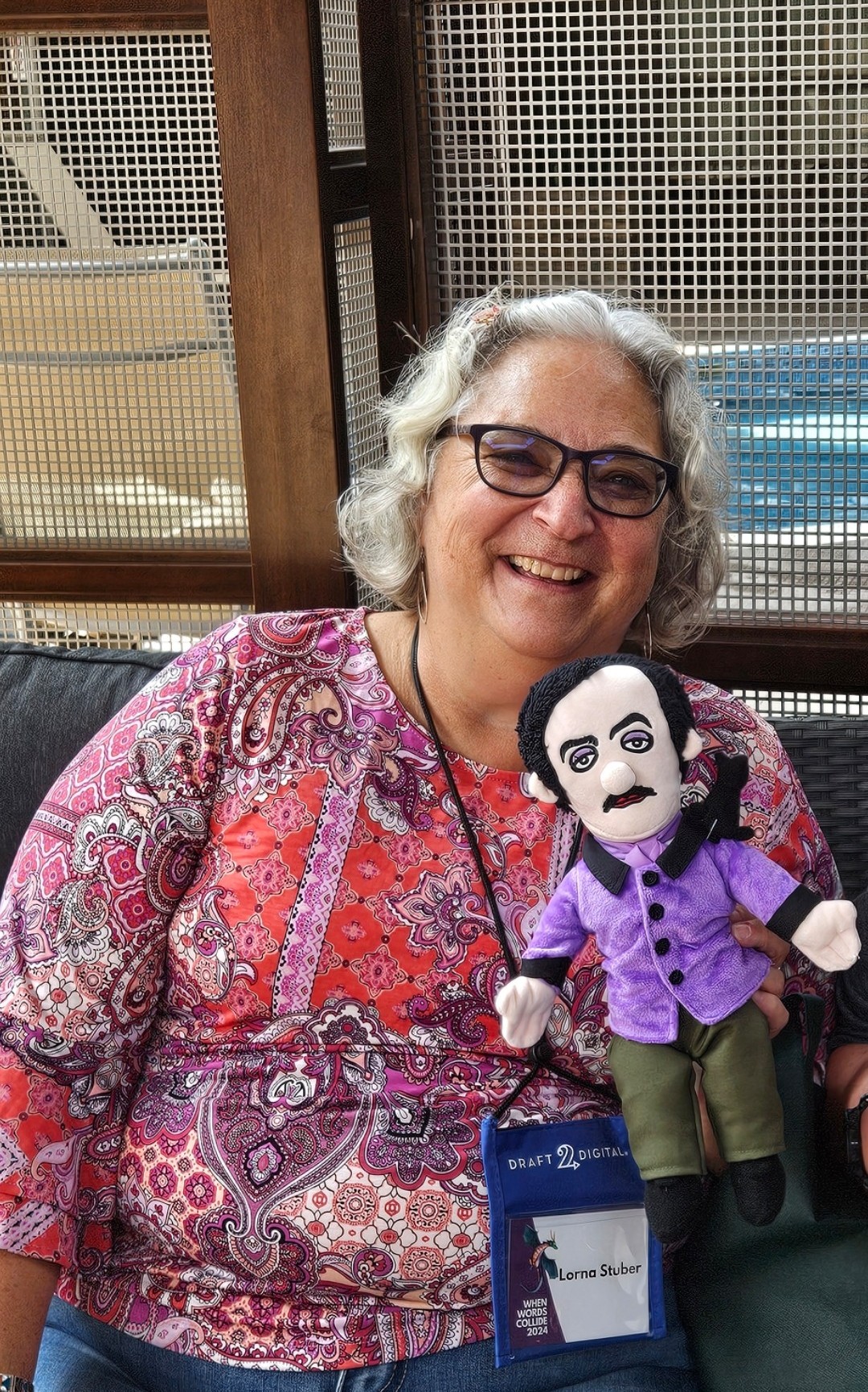 I live alone, so it’s pretty quiet in my office except for SiriusXM, which I always have playing through the computer speakers. And I have a new office assistant as of August this year – my new Edgar Allan Poe stuffy, complete with a (velcro) removable raven on his shoulder! He’s purple and soft, and I love him.🙂
